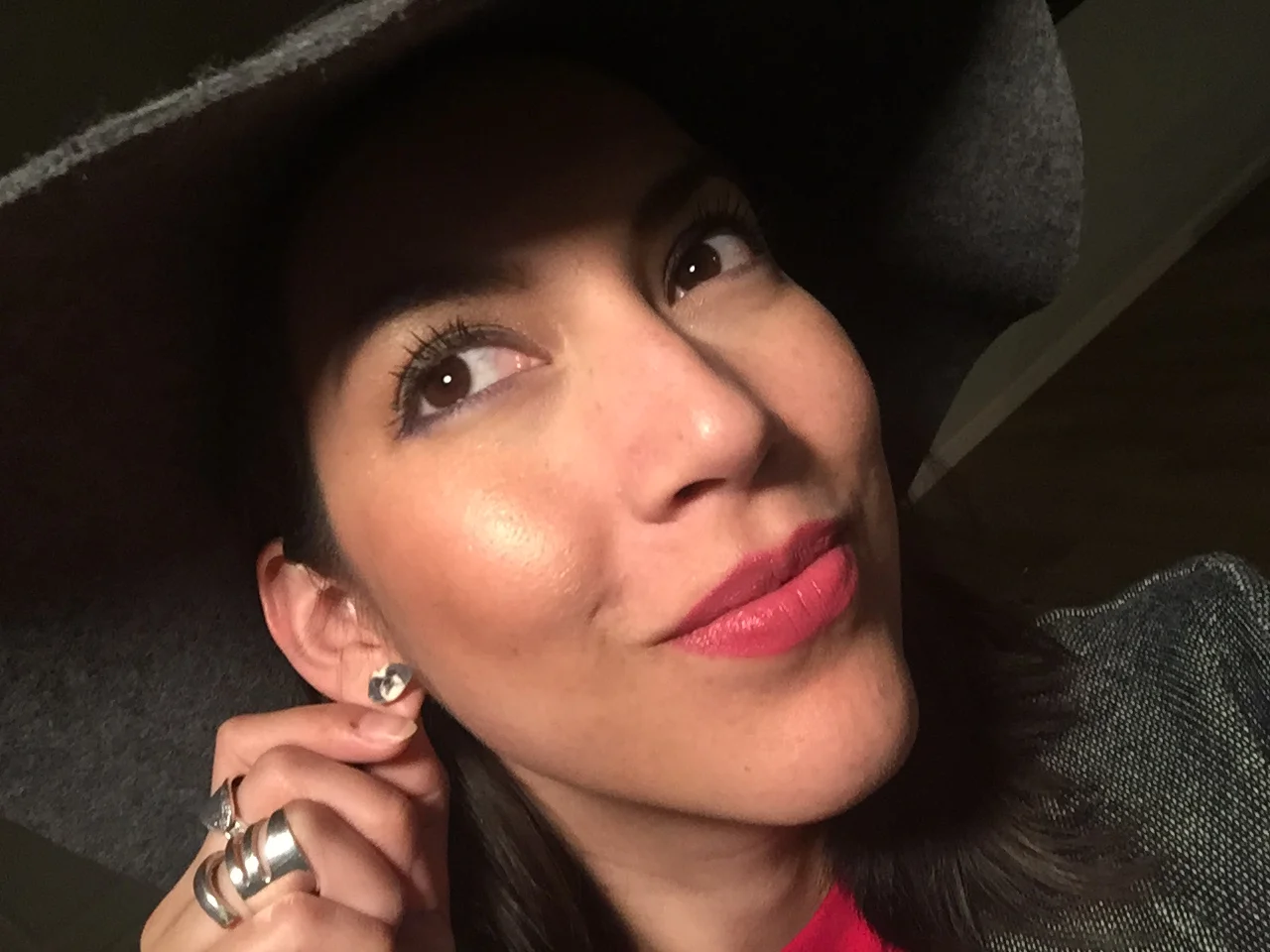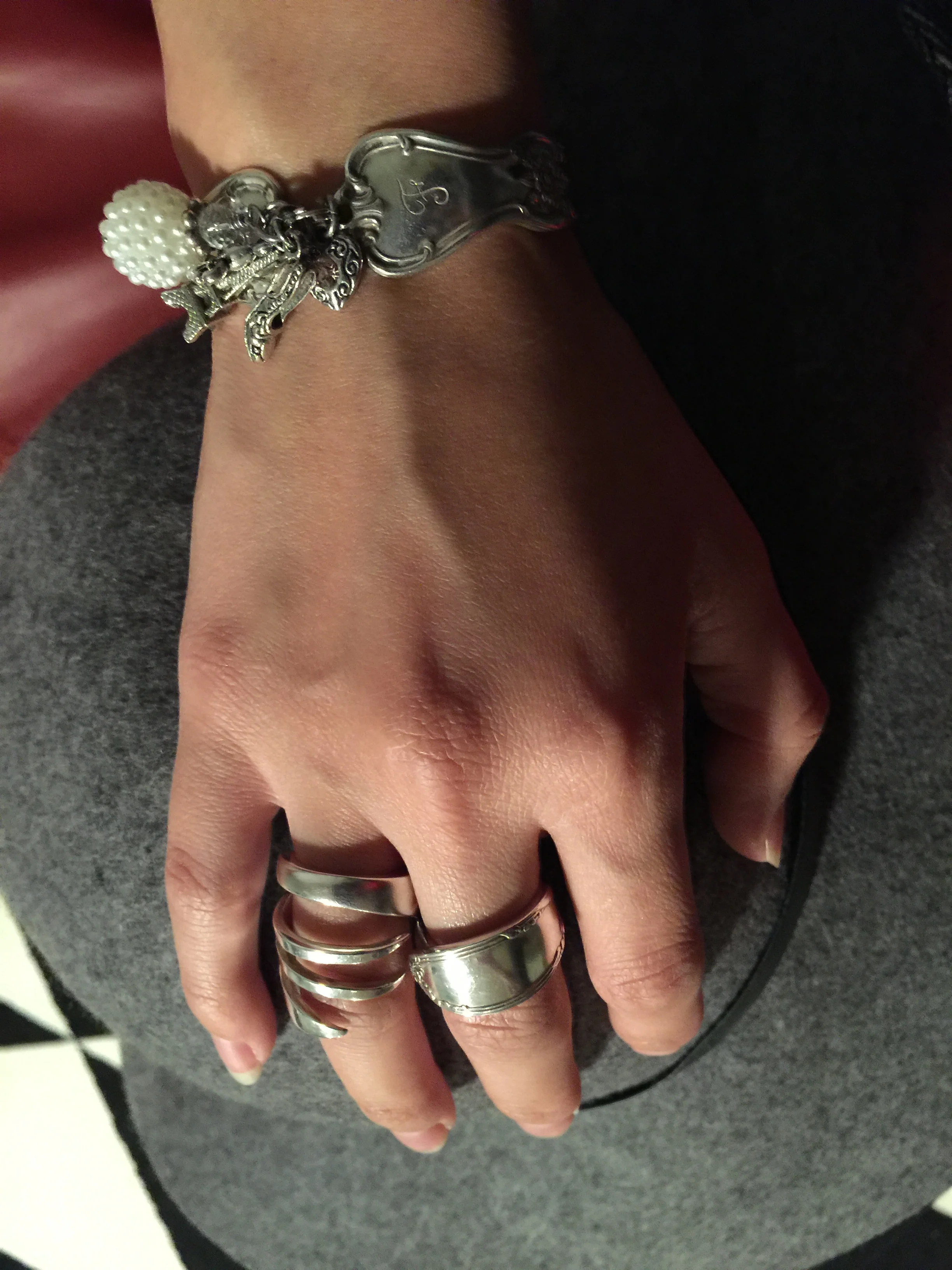 I love to incorporate (discrete) surprise items to my wardrobe! ¡Me encanta detalles fashionista de sorpresa! It gives a quirky feel to a day at the office without looking unprofessional. Looking at the complete outfit, you see: dress pants with boots, a professional top, blazer, discrete jewelry, hat and a purse. Looking closer, though, surprise! ¿Vistes el imagen de mi perrito Gizmo en los arretes?? My earrings showcase my Shih Tzu Gizmo, and the jewelry I’m wearing include two rings made from a recycled fork and a recycled fork bracelet with my last initial.